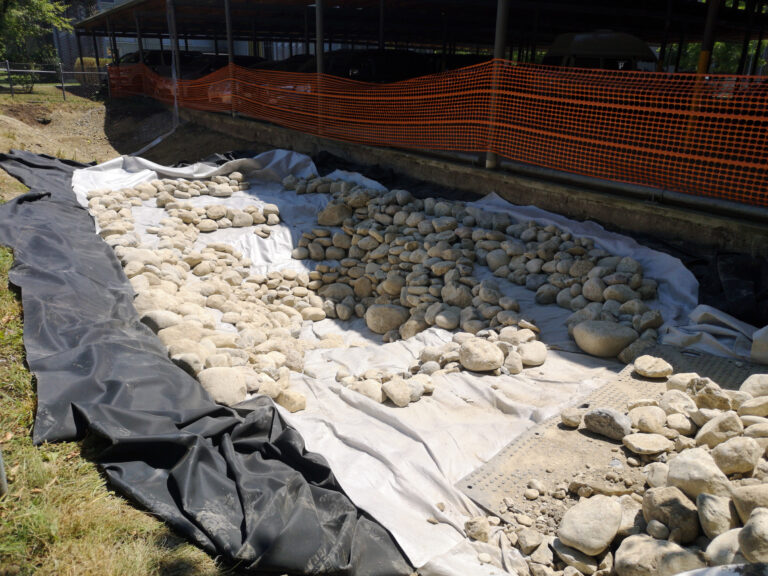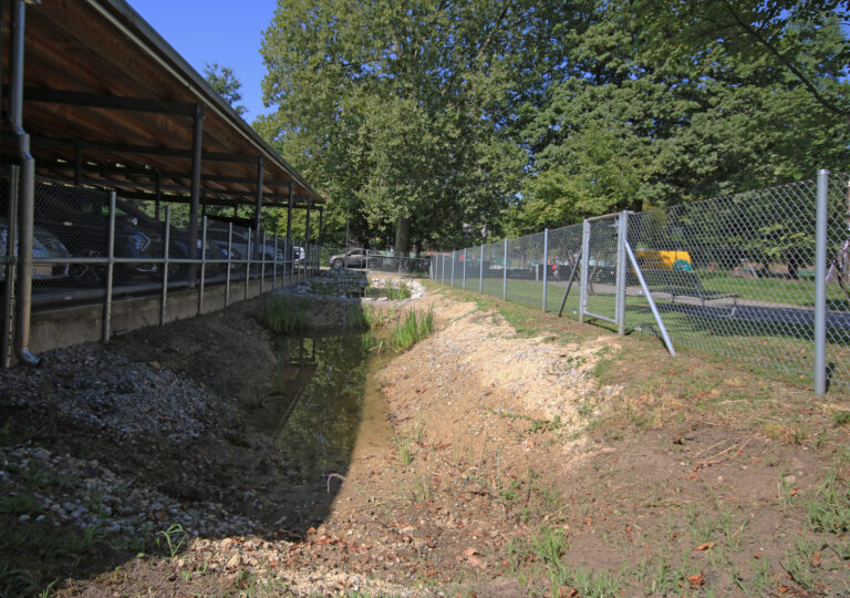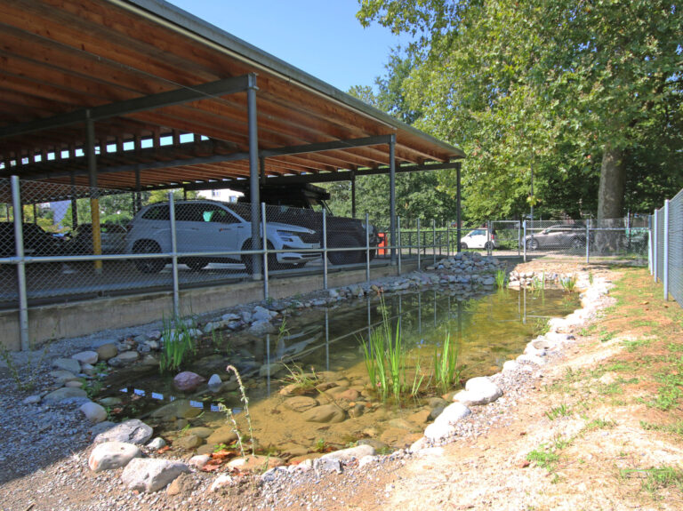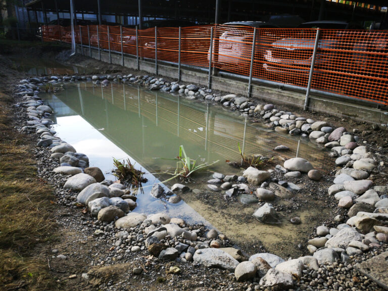 Die bestehende Versickerungsanlage wurde vertieft und in zwei Becken geteilt. Die eine Hälfte dient weiterhin als Versickerungsgrube, die andere Hälfte wurde zum Biotop ausgebaut.