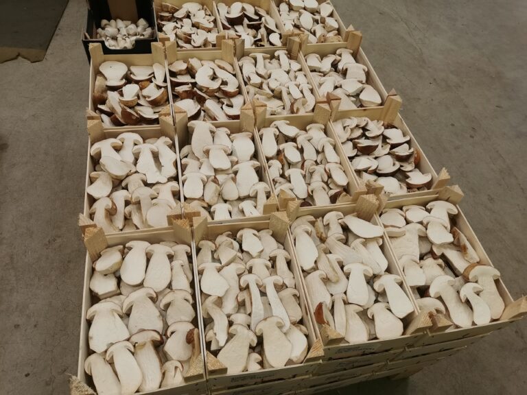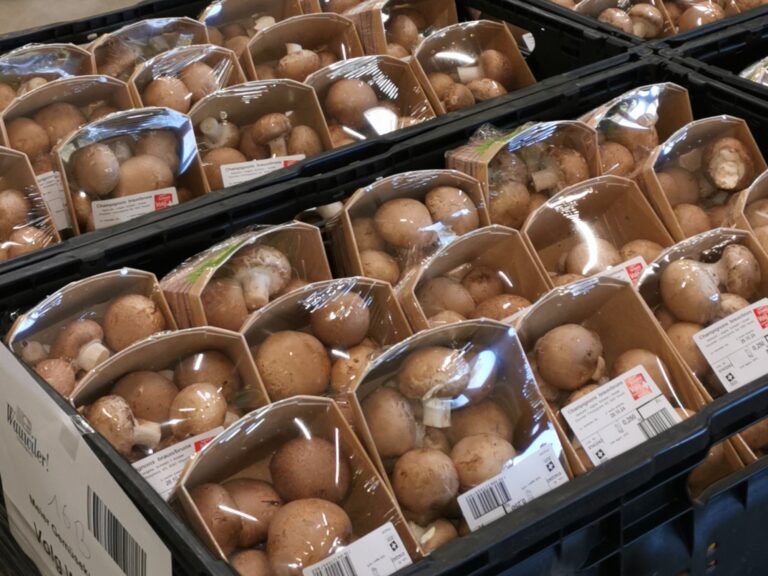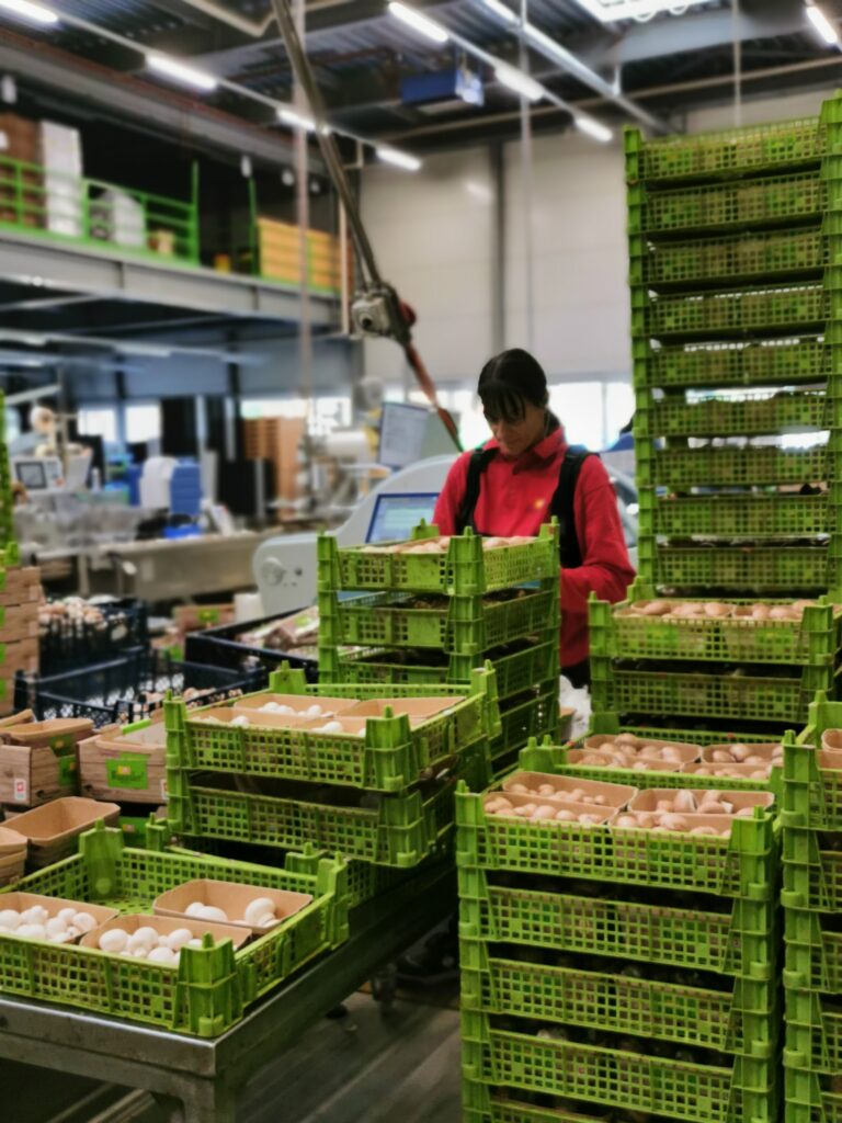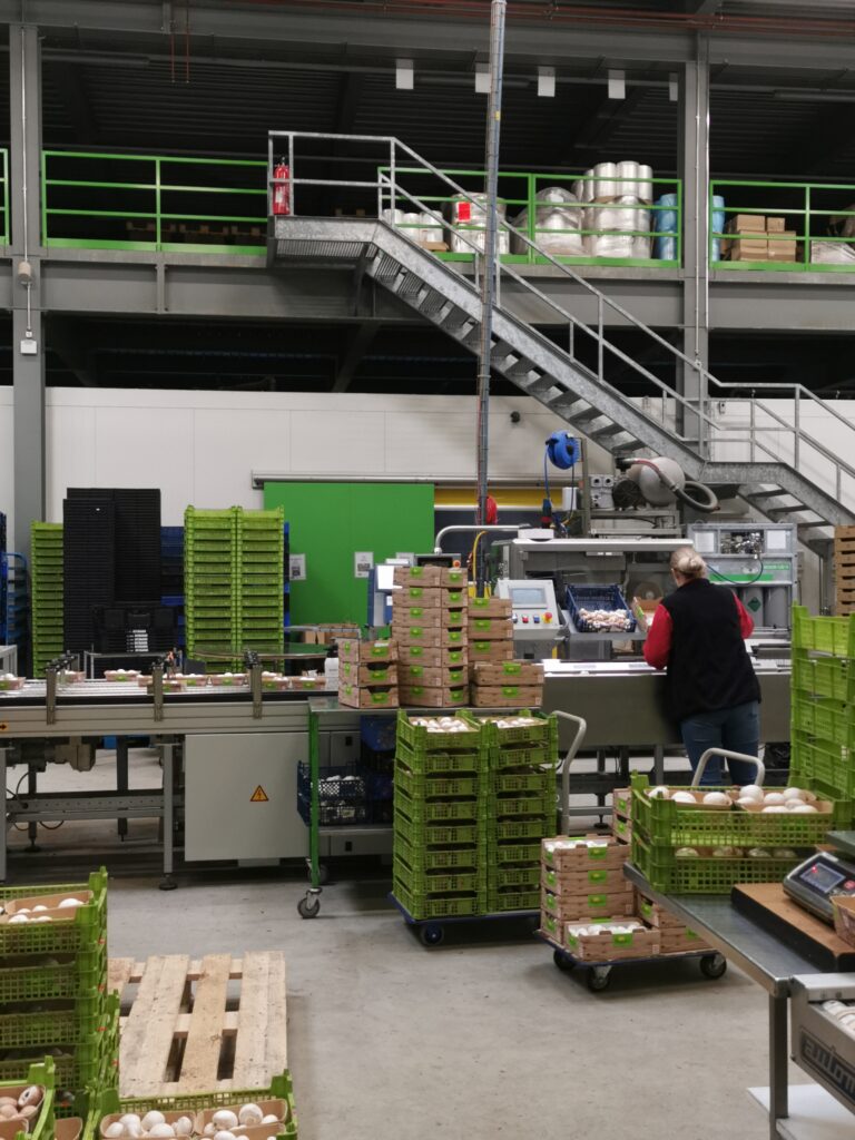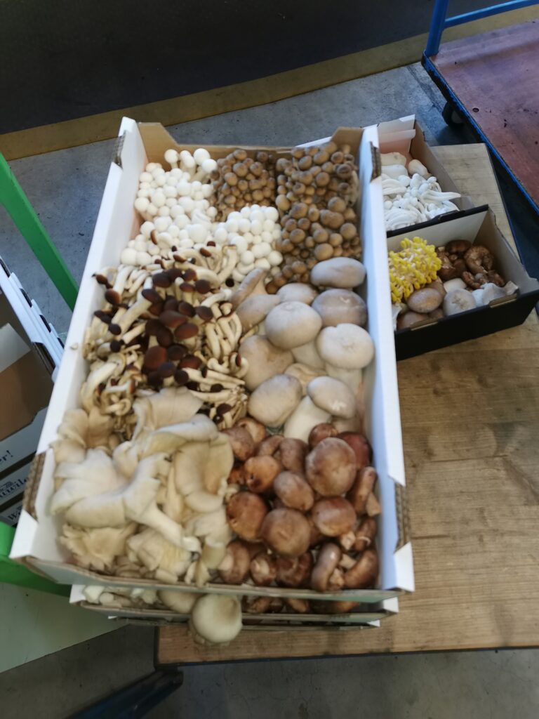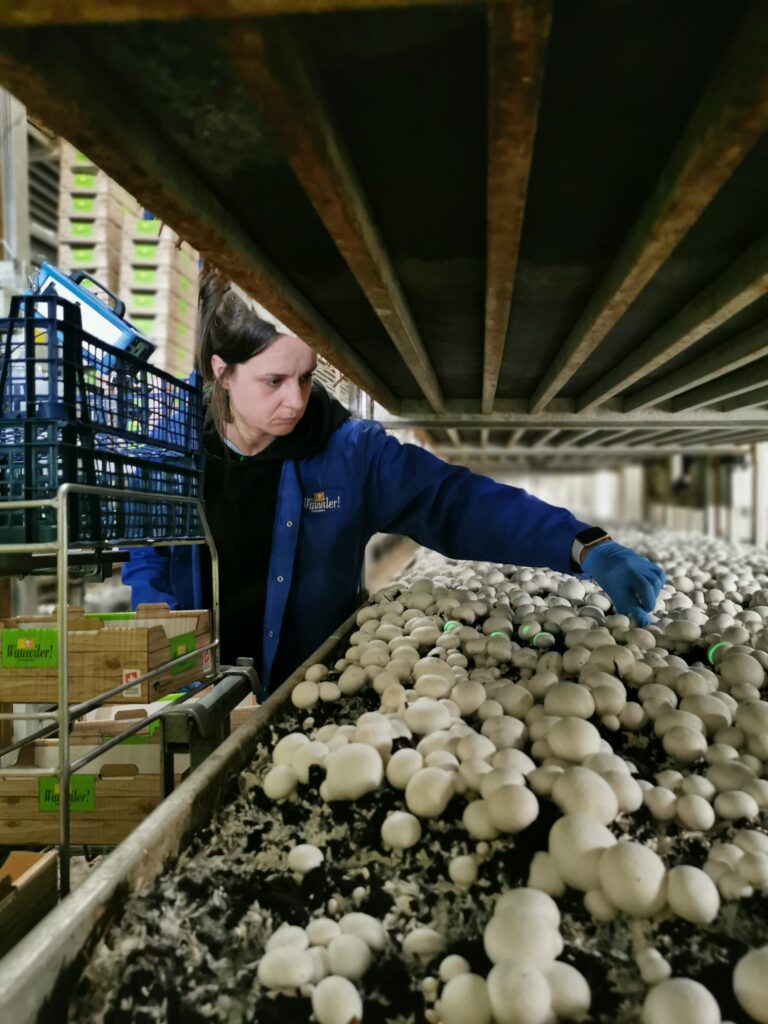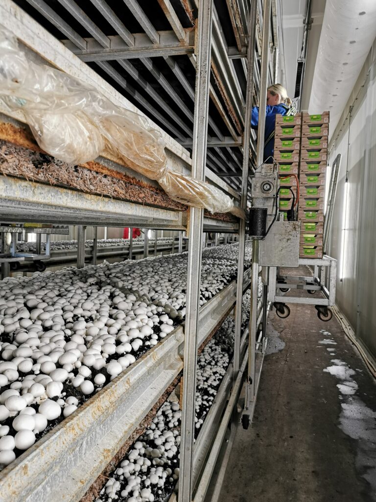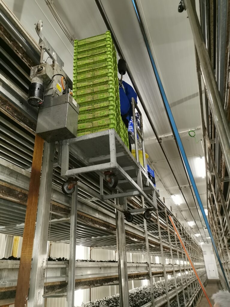 Um die Pilze zu ernten, werden die Mitarbeitenden des Unternehmens mit einem Lift auf die verschiedenen Regalhöhen gebracht. Bei kleinen Kostproben konnte die Frische und Qualität der Pilze getestet werden. Es war ein einmaliger und interessanter Einblick für die Teilnehmenden.